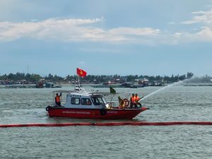Ca nô biên phòng phối hợp lực lượng ứng phó sự cố tràn dầu triển khai phao SOS BOOM 24 để cô lập nguồn dầu tràn (giả định) trên vùng nước, dựa trên hướng gió, dòng nước…